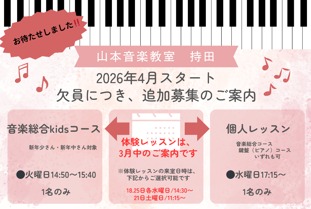 (鍵盤コースからの新規スタート受け入れは、いっぱいでお断りの時期もあり、空き枠がマッチングしない場合には、半年以上お待ち頂いております)